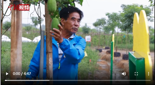 【解说】赖淡说自己是农民,不怕淋雨,但与传统农民相比,其实他更是一位“技术达人”。这是他在湖南省种出的苦瓜,名为白玉苹果苦瓜,这是台湾甜丝瓜,这是黄金百香果,都是经过他的技术改良后的品种。现在他也将这些“高科技”品种带到了广东肇庆,因为就在近期,两家海峡两岸乡村融合发展试验区研究实践所就在这里揭牌。