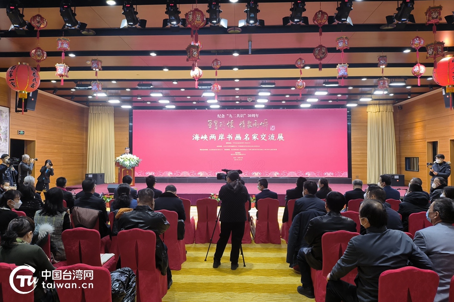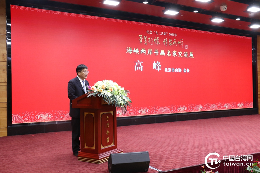 中国台湾网1月6日北京讯 (记者 尹赛楠)6日上午,由北京市台办指导,北京市台联、民革北京市委主办,北京海峡两岸书画家联谊会、台湾文联台湾书法家协会、两岸和平志愿者联盟协办的“纪念九二共识30周年之笔墨抒怀 情聚两岸——海峡两岸书画名家交流展”在北京台湾会馆隆重开幕。国务院台办新闻局局长、新闻发言人马晓光,北京市委统战部副部长黄克灜,北京市台联党组书记黄塞溪,北京市台联会长高峰,北京市台办副主任张磊等领导出席开幕式,来自两岸书画艺术界的百余位嘉宾以线上线下方式出席活动。