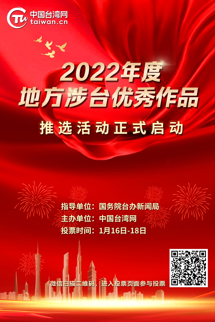 为盘点、梳理过去一年来地方涉台活动精彩亮点,展示各地涉台宣传报道成效。经国台办批准,中国台湾网“2022年度地方涉台优秀作品”推选活动于1月16日正式上线启动。本次推选活动共设置优秀稿件、优秀视频、优秀新闻图片三个奖项。两岸网友可通过新浪微博、今日头条、微信公众号、Facebook等新媒体平台进行投票。