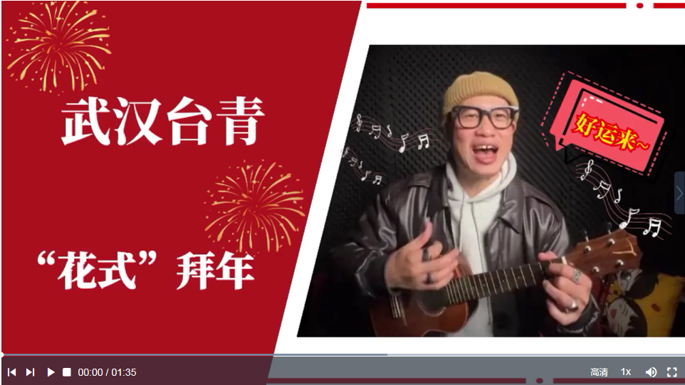 “好运来,我们好运来,好运来带来了喜和爱……”在湖北武汉发展的台湾青年导演薛颖穜用弹唱《好运来》的方式给大家拜年啦!新的一年,他期待有更多的台湾青年主动融入祖国发展,把幸福和梦想牢牢抓在自己的手中!