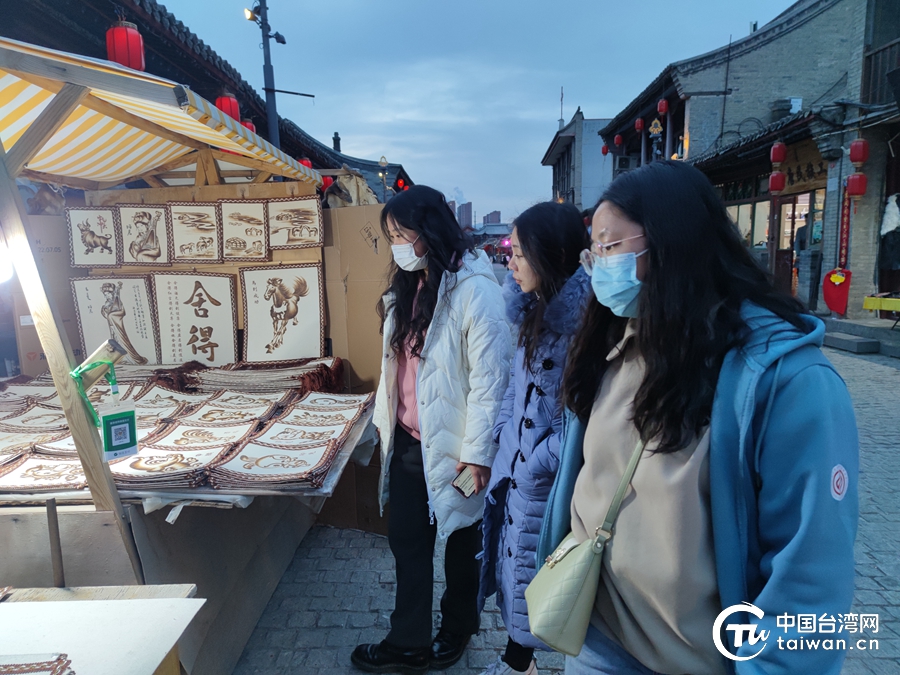 营员们在塞上老街欣赏内蒙古传统手工艺品烫画。(中国台湾网 高嘉鸿 摄)