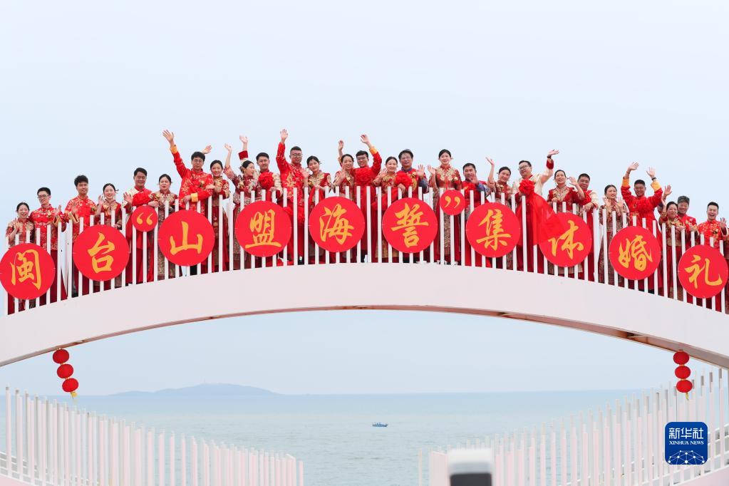 当日,一场以“爱情恒久远、幸福长相伴”为主题的闽台“山盟海誓”集体婚礼暨2023年闽台婚姻家庭交流活动在福建省福州市平潭县举办。21对闽台新人身穿红色中式婚服,手牵红绣球,行跨火盆、踩瓦片、扎绣球和“合茶”、“合卺”、“海誓”等闽台传统结婚礼仪,结下跨越海峡的姻缘。