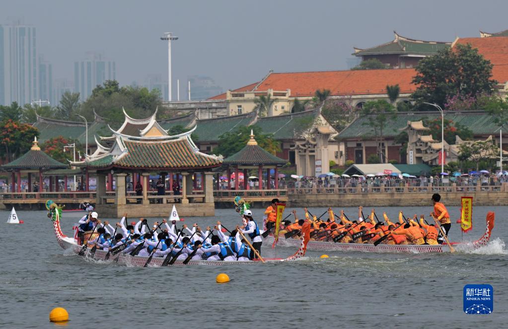 6月3日,在福建厦门集美龙舟池,来自海峡两岸的龙舟队竞渡争先。