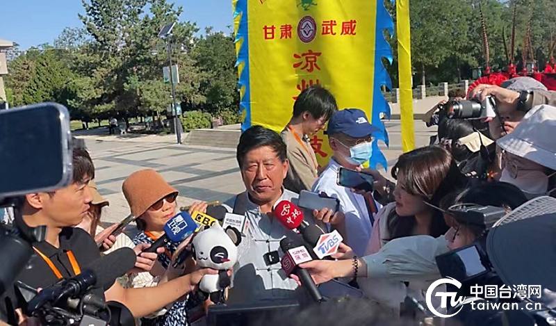 国家级非物质文化遗产“凉州攻鼓子”传承人杨门元接受两岸媒体采访。(中国台湾网 常凯特 摄)