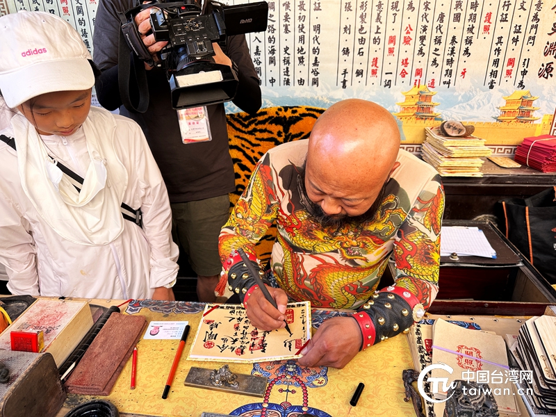 嘉峪关“网红”关长正在“关照”上书写通关“谜语”。 (中国台湾网 李柏涛 摄)