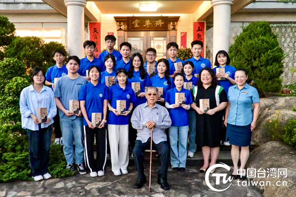 图为漳州天福茶业有限公司创始人李瑞河先生为实践队成员赠书并合影留念。(中国台湾网发)