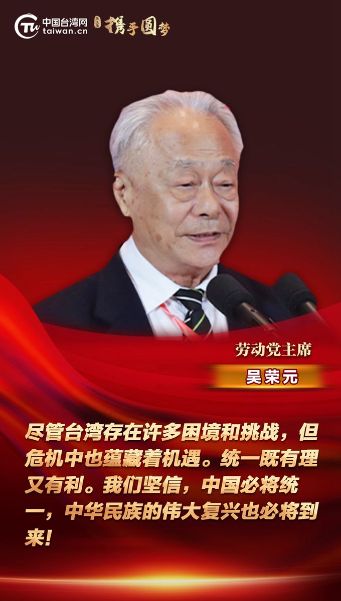 第三届“携手圆梦——两岸同胞交流研讨活动”7月25日在南京开幕。劳动党主席吴荣元在致辞时表示,尽管台湾存在许多困境和挑战,但危机中也蕴藏着机遇。统一既有理又有利。我们坚信,中国必将统一,中华民族的伟大复兴也必将到来!