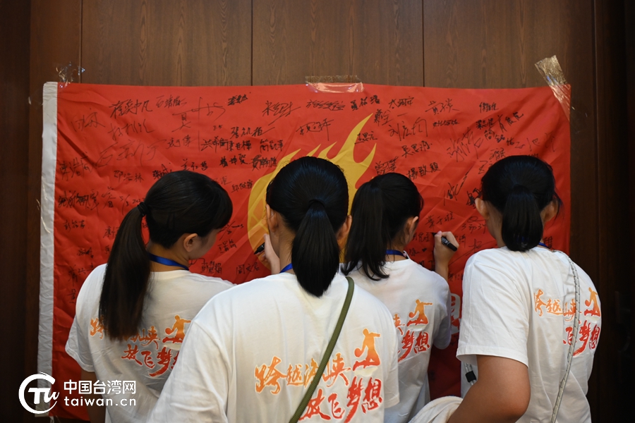 同学们在营旗上签下自己的名字,留下时光的印记。(中国台湾网 徐绍轩 摄)
