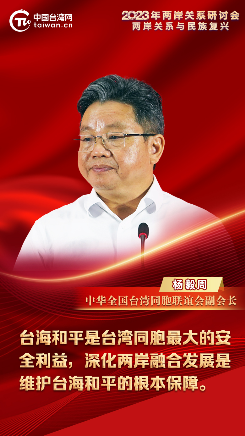 2023年两岸关系研讨会8月17日上午在四川成都开幕。中华全国台湾同胞联谊会副会长杨毅周在致辞时表示,台海和平是台湾同胞最大的安全利益,深化两岸融合发展是维护台海和平的根本保障。