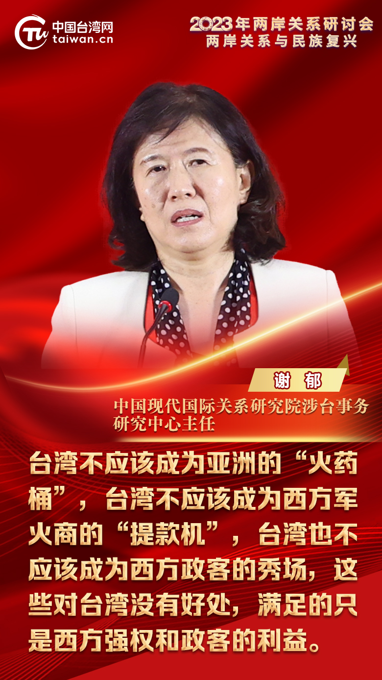 2023年两岸关系研讨会8月17日上午在四川成都开幕。中国现代国际关系研究院涉台事务研究中心主任谢郁在活动上表示,台湾不应该成为亚洲的“火药桶”,台湾不应该成为西方军火商的“提款机”,台湾也不应该成为西方政客的秀场,这些对台湾没有好处,只满足的是西方强权和政客的利益。