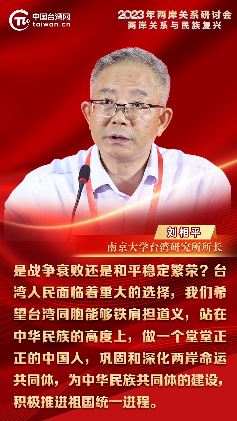 2023年两岸关系研讨会8月17日上午在四川成都开幕。南京大学台湾研究所所长刘相平在活动上表示,是战争衰败还是和平稳定繁荣?台湾人民面临着重大的选择,我们希望台湾同胞能够铁肩担道义,站在中华民族的高度上,做一个堂堂正正的中国人,巩固和深化两岸命运共同体,为中华民族共同体的建设,积极推进祖国统一进程。
