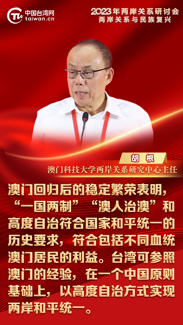 2023年两岸关系研讨会17日、18日连续两天在四川成都举办。澳门科技大学两岸关系研究中心主任胡根18日在研讨会上表示,澳门回归后的稳定繁荣表明,“一国两制”“澳人治澳”和高度自治符合国家和平统一的历史要求,符合包括不同血统澳门居民的利益。可参照澳门的经验,在一个中国原则基础上,以高度自治方式实现两岸和平统一。