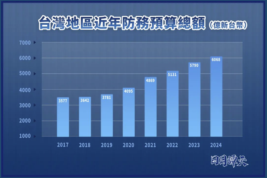 8月31日,台防务部门将2024年度防务预算书递交台立法机构审查。有媒体报道,台湾地区明年的防务预算总额达6068亿元新台币,再创新高。