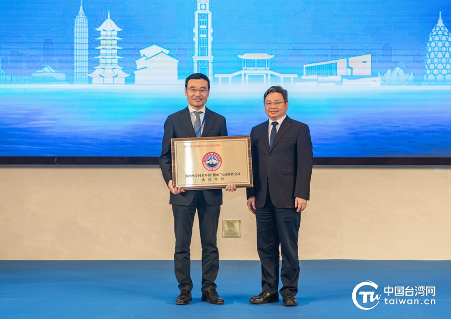 杨毅周为横山桥镇加盟海峡两岸同名乡镇“横山”互动协作会议授牌。(中国台湾网 发)