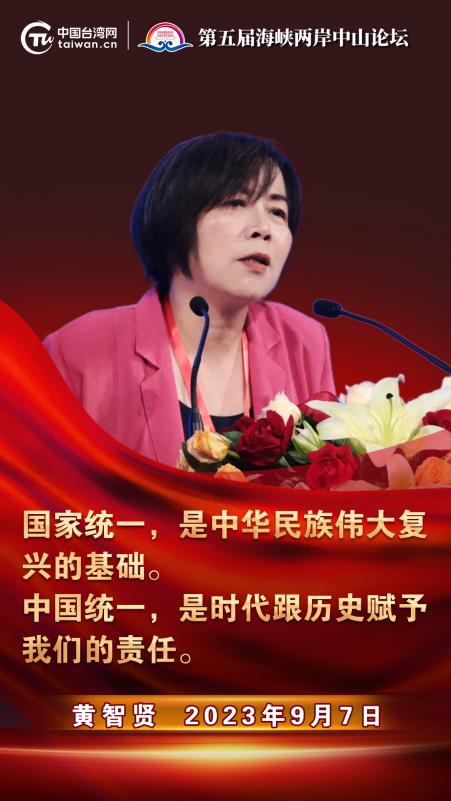 2023年9月7日下午,第五届海峡两岸中山论坛在广东省中山市开幕。台湾作家、政治评论员黄智贤在致辞时表示,国家统一,是中华民族伟大复兴的基础。中国统一,是时代跟历史赋予我们的责任。