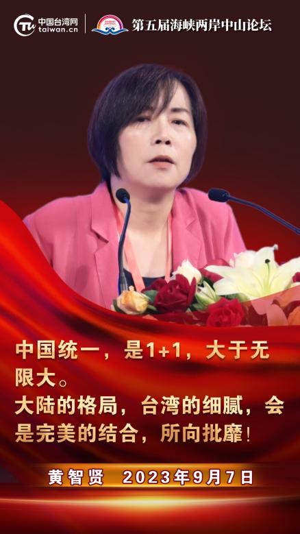 2023年9月7日下午,第五届海峡两岸中山论坛在广东省中山市开幕。台湾作家、政治评论员黄智贤在致辞时表示,中国统一,是1+1,大于无限大。大陆的格局,台湾的细腻,会是完美的结合,所向批靡!