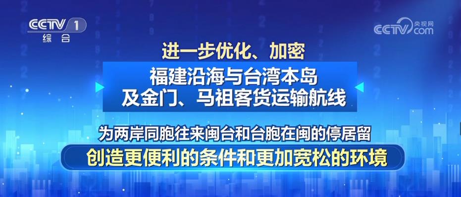 二是进一步优化、加密福建沿海与台湾本岛及金门、马祖客货运输航线,为两岸同胞往来闽台和台胞在闽的停居留,创造更便利的条件和更加宽松的环境。