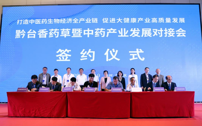 图为7月19日举行的“黔台香药草暨中药产业发展对接会”签约仪式现场,这是2023年“贵州·台湾经贸交流合作恳谈会”系列活动之一。