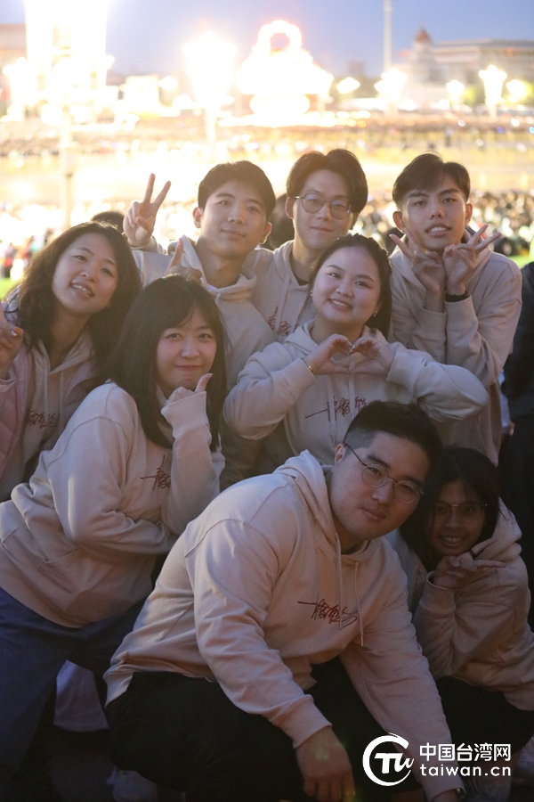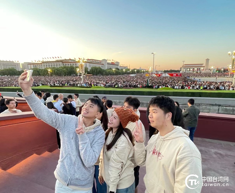 10月1日,来自北京、上海、广州、福建等地高校的44名台湾学生来到北京天安门城楼东侧观礼台观看升旗仪式。(林家纬 供图,中国台湾网 发)