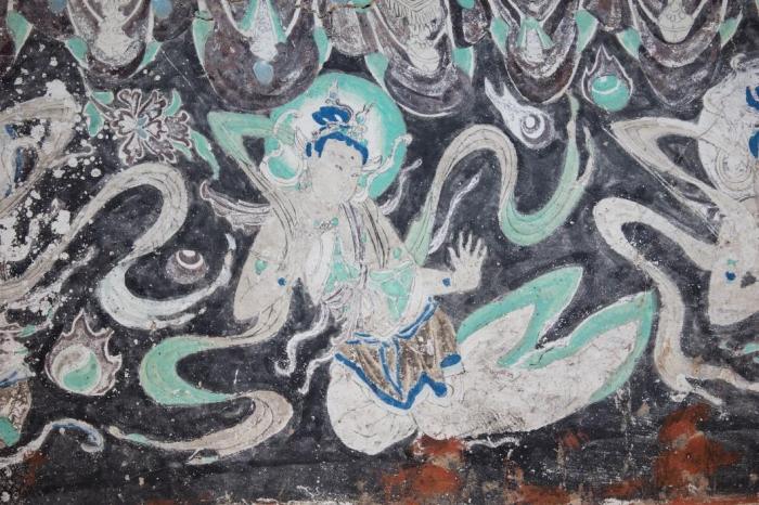10月12日,两岸合办的《妙音莫高──敦煌乐舞专题展》在线上开展。图为展览中呈现的敦煌榆林窟中的飞天乐伎。敦煌研究院供图