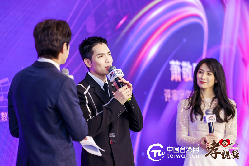 图为孝亲公益形象大使、台湾歌手萧敬腾(中)参加第三届孝亲奖大赛颁奖典礼。(旺旺集团供图)