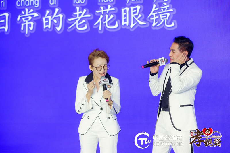 图为颁奖典礼上,知名歌手文章(右)与马来西亚作曲者黄汇雯(左)共同演唱获奖歌曲《老花眼镜》。(旺旺集团供图)