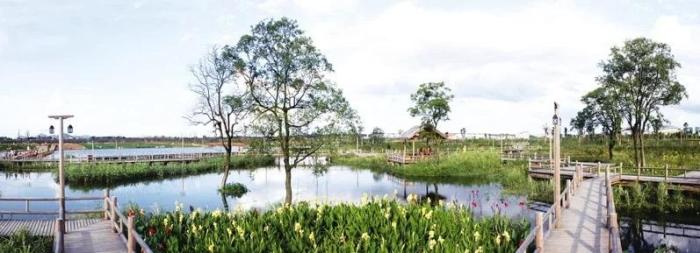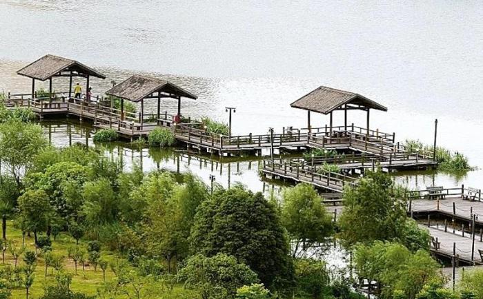 湿地公园是由河流、湖泊和水田等构成的复合湿地生态系统,由“江甸文荟”“云天水庄”“芳菲翠堤”等13个景点组成,分布在江两岸,形成了一个南北长1322米的人文生态长廊。