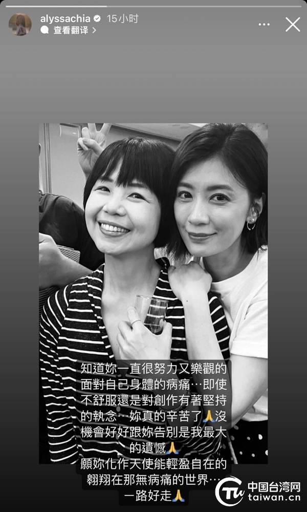贾静雯发文悼念陈慧翎。(中国台湾网 发)