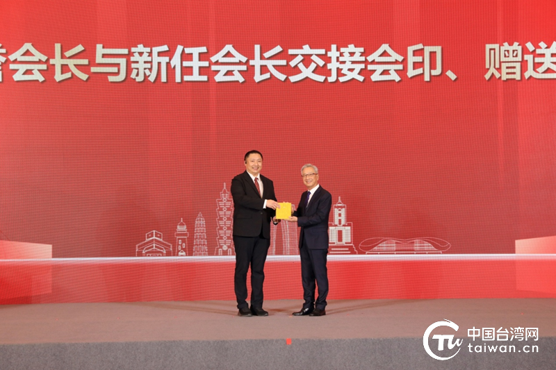 会上,苏州台协荣誉会长谢清福(右)与新任会长邱士楷(左)交接会印。(中国台湾网 尹赛楠 摄)