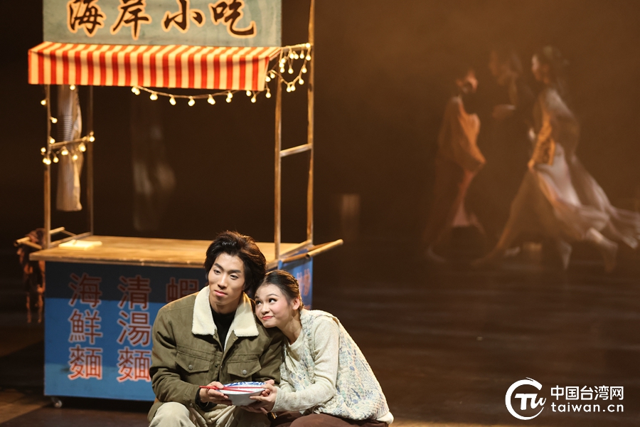 表演中,两位舞者推着“两岸小吃”车,时而踏乐而舞,面对“风浪”时,又依偎在一起,携手而行,画面温馨动人。