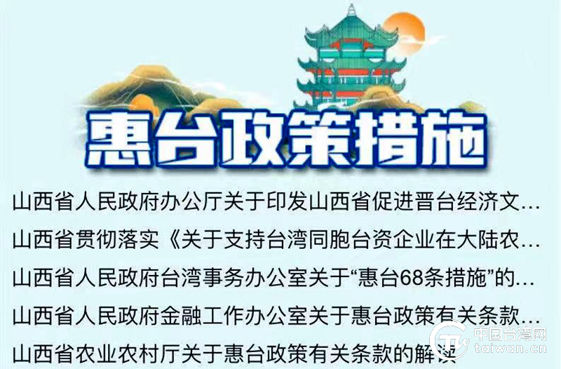 加大系列惠台措施宣传介绍和落实力度,提升服务质量,优化营商环境,支持台企台商台胞在晋更好发展,海峡两岸(高平)产业园集聚力提升,海峡两岸(太原)产业园建设取得新进展。