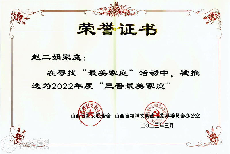台胞赵二娟家庭获评“三晋最美家庭”荣誉称号。(山西省台办供图)