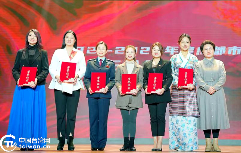 台胞周玉如(左一)荣获成都市“三八红旗手”荣誉称号(中国台湾网发)