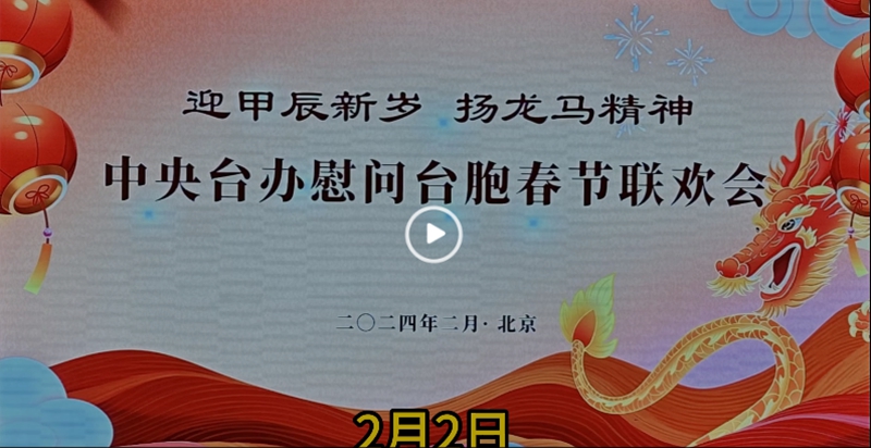 2月2日,“迎甲辰新岁 扬龙马精神”中央台办慰问台胞春节联欢会在北京举办。中央台办有关负责人与台胞代表座谈交流,中共中央台办、国务院台办主任宋涛出席活动并讲话,表达对广大台胞的新春祝福。6名台胞代表发言,分享在大陆学习工作生活的经历和感悟,期待为两岸交流、融合发展和祖国统一奉献力量。