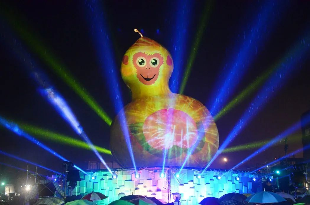 要说奇葩花灯,那就不得不提“福禄猴”了。2016年台北灯节上,这只猴横空出世,被嘲“雷倒众生”。该花灯为台北市花904万元新台币打造的猴年主灯,高14.2米,通体为葫芦形状,身上画有猴脸、桃子、金鱼等图案。然而,造型一经公布就被嫌到不行,还一度传出吓哭小孩。正式点灯时,主办方在原定5分钟的声光秀后又加上2分钟网友恶搞投影,自嘲“史上最丑的灯”“猴子被丝袜套头”,才使嘘声变笑声。