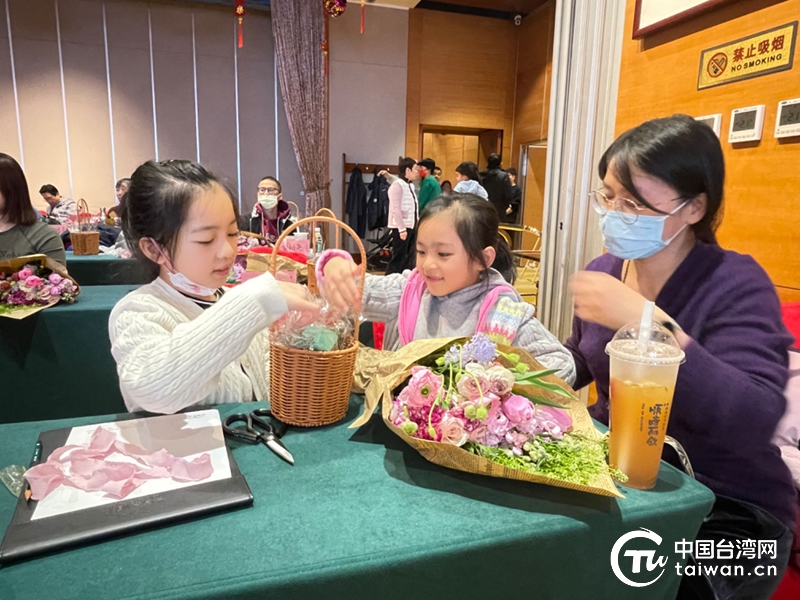 3月2日,北京市台联在台湾会馆举行“台胞之家志愿服务队”成立大会,在会后的插花活动中,颐宝、和宝正在和妈妈郑宜容一起学插花。(中国台湾网 常凯特 摄)
