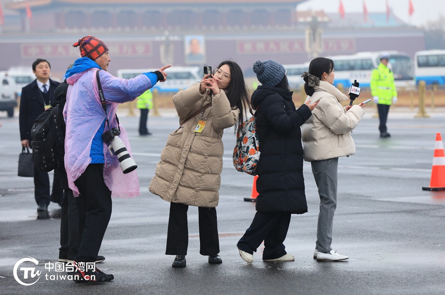 人民大会堂外,不少青年记者正在采访。(中国台湾网记者 尹赛楠 摄)