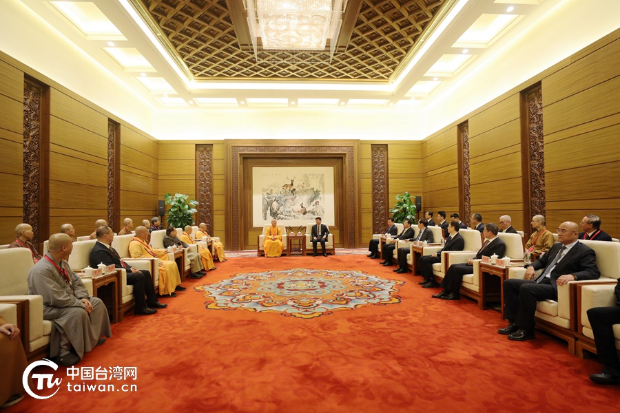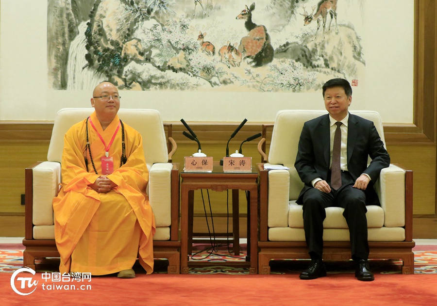 中共中央台办、国务院台办主任宋涛会见台湾中华人间佛教联合总会主席、佛光山寺住持心保法师一行。(中国台湾网记者 尹赛楠 摄)
