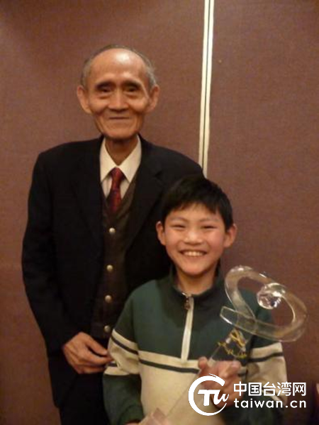 2012感动中国年度人物评选揭晓,菏泽旅台同乡会会长高秉涵成功入选。左一为高秉涵先生,左二为9岁的刘承志。(中国台湾网 发)