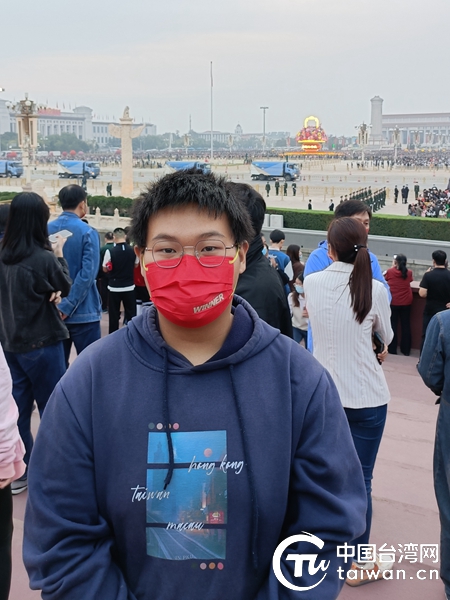 2022年10月1日,北京大学台生刘昱甫参加全国台联组织在京台生观礼天安门升旗仪式留念。(中国台湾网 发)