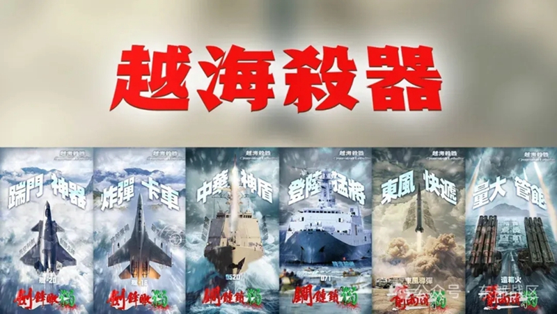 值得一提的是,演训当天,解放军发布名为《越海杀器》的组合海报,使用6款装备特写画面,包括“踹门神器”歼-20、“炸弹卡车”歼-16、“中华神盾”052D、“登陆猛将”071、“东风快递”东风导弹、“量大管饱”远程箱式火箭炮,均为解放军主战装备中的“王牌明星”。有大陆军事专家分析,解放军亮出“杀独利器”意在表明,我们现在用什么装备参加演习,未来就会用什么装备来进行实战,“遏制‘台独’分裂和外部势力干涉,解放军说到做到。”