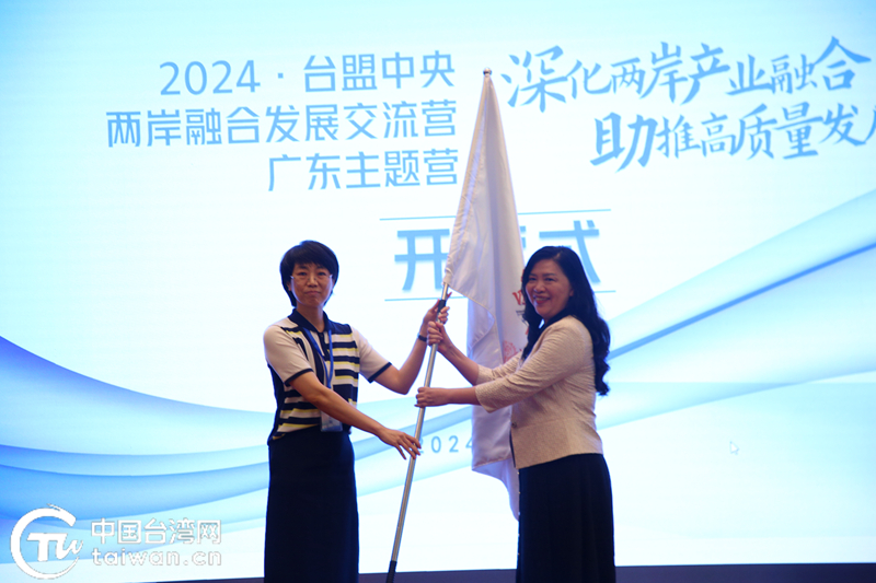 台盟中央联络部副部长王若锟向台盟广东省委会副主委、台盟深圳市委会主委林娜授营旗。(台盟中央供图)