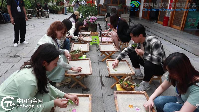 在花茂村,两岸青年们体验了古老而神秘的古法造纸纸浆压花画技艺。(中国台湾网记者 孙路路 摄)
