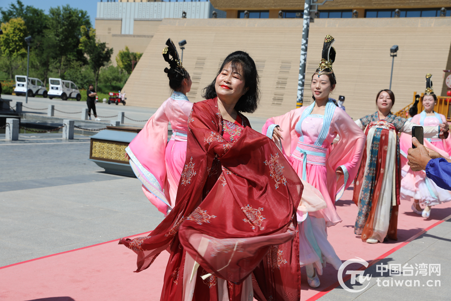 在汉唐天马城,两岸媒体记者来了一场变装秀。大家身着“汉服”,或华丽高贵,或端庄优雅,一秒梦回汉唐。在典雅的乐曲中,大家随着同样身着古装、衣袂飘飘的舞者,一起轻摆衣袖,缓步起舞,仿若一同从古时穿越而来。