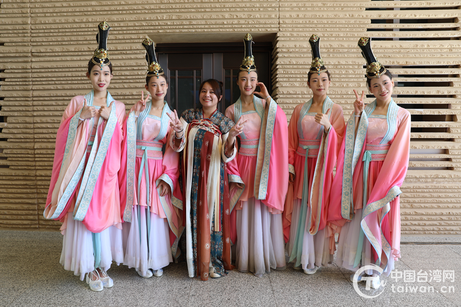 台湾青年与汉唐天马城内的舞者合影。(中国台湾网记者 李宁 摄)