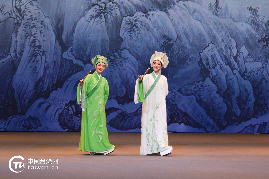 浙江小百花越剧团青年越剧演员陈丽君、徐叶娜表演新版越剧《十八相送》。(中国台湾网记者 尹赛楠 摄)
