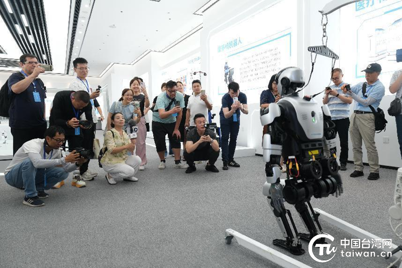 采访团一行在绵阳科技城新区的机器人智能制造产业园拍摄。(中国台湾网 发)
