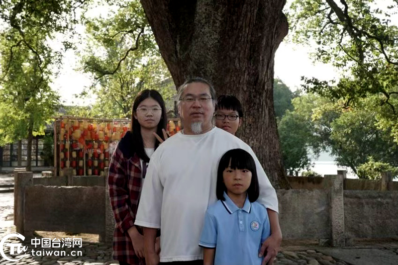 台胞高宏镇(左二)和他的三个孩子在莲都古堰画乡的古樟树前合影。(中国台湾网记者 刘赛飞 摄)