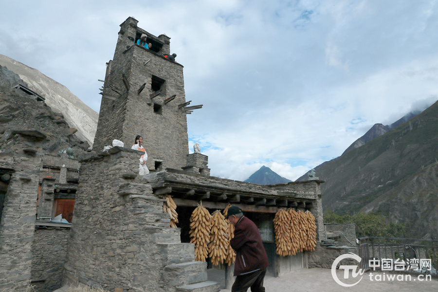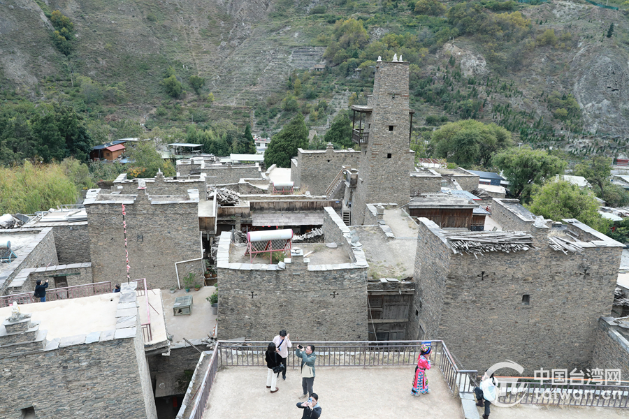 游客在桃坪羌寨拍照留念。(中国台湾网记者 李宁 摄)
