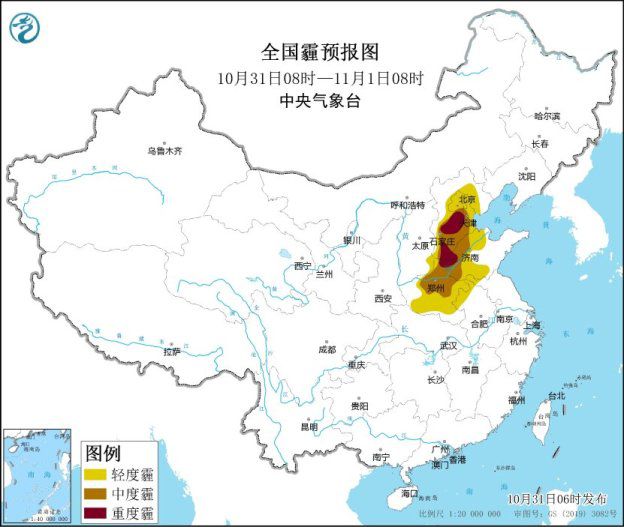 另外,10月31日至11月1日早晨,华北中南部、黄淮西部等地大气扩散条件较差,有轻至中度霾,部分地区有重度霾,夜间至早晨时段有大雾;建议公众外出做好防护。11月1日白天受偏北风影响,上述地区雾、霾天气减弱。